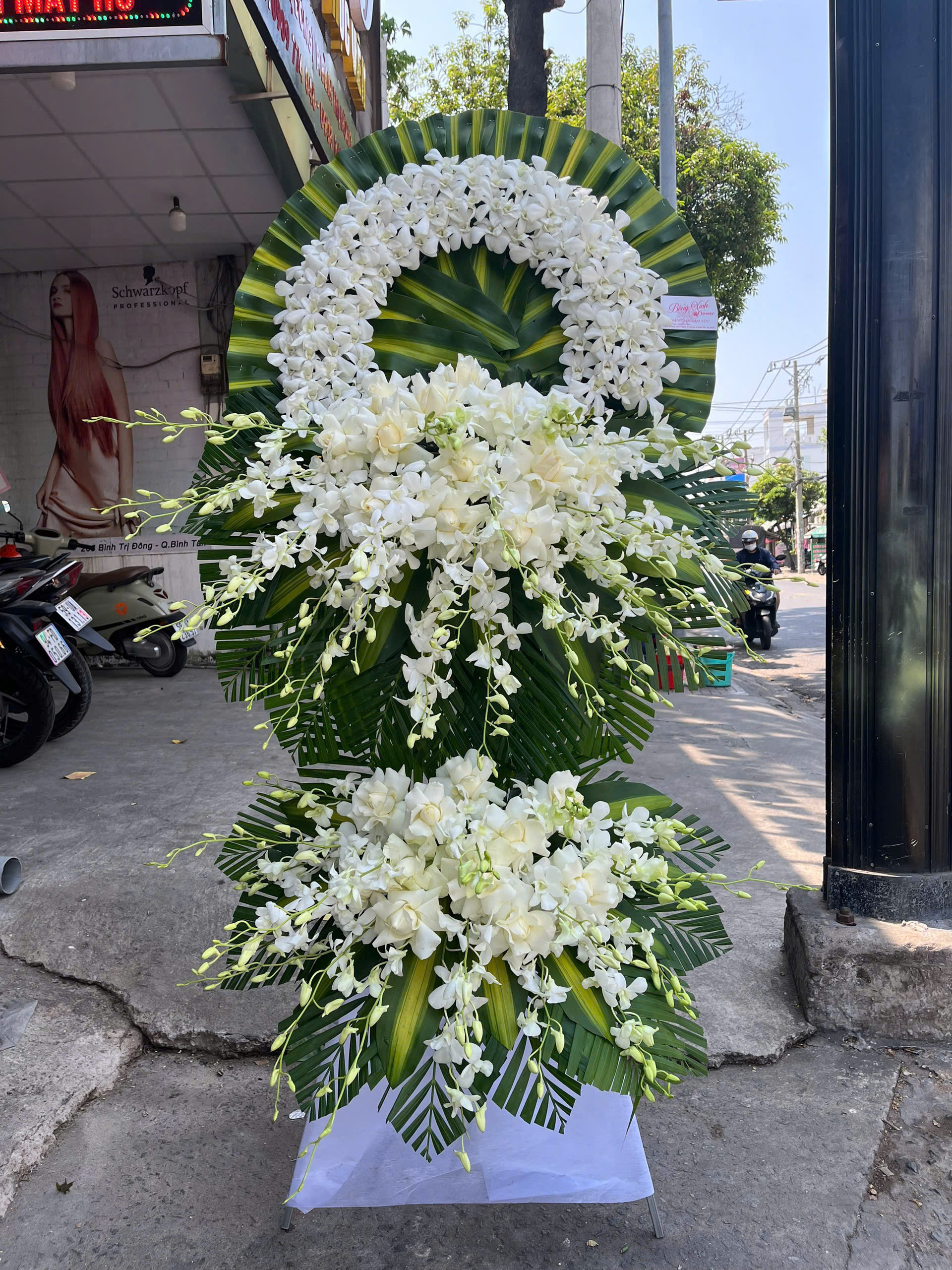 - Kệ hoa được thiết kế nổi bật với tone trắng chủ đạo, sử dụng hoa lan trắng kết hợp cùng hoa phụ và lá xanh. Phần vòng tròn phía trên tượng trưng cho sự vĩnh cửu, như một lời cầu chúc cho người đã khuất được an yên nơi cõi vĩnh hằng. Phía dưới là cụm hoa được kết dày dặn, tạo cảm giác đầy đặn, cân đối. Tổng thể kệ hoa mang lại sự trang trọng nhưng vẫn rất nhẹ nhàng, không quá phô trương.